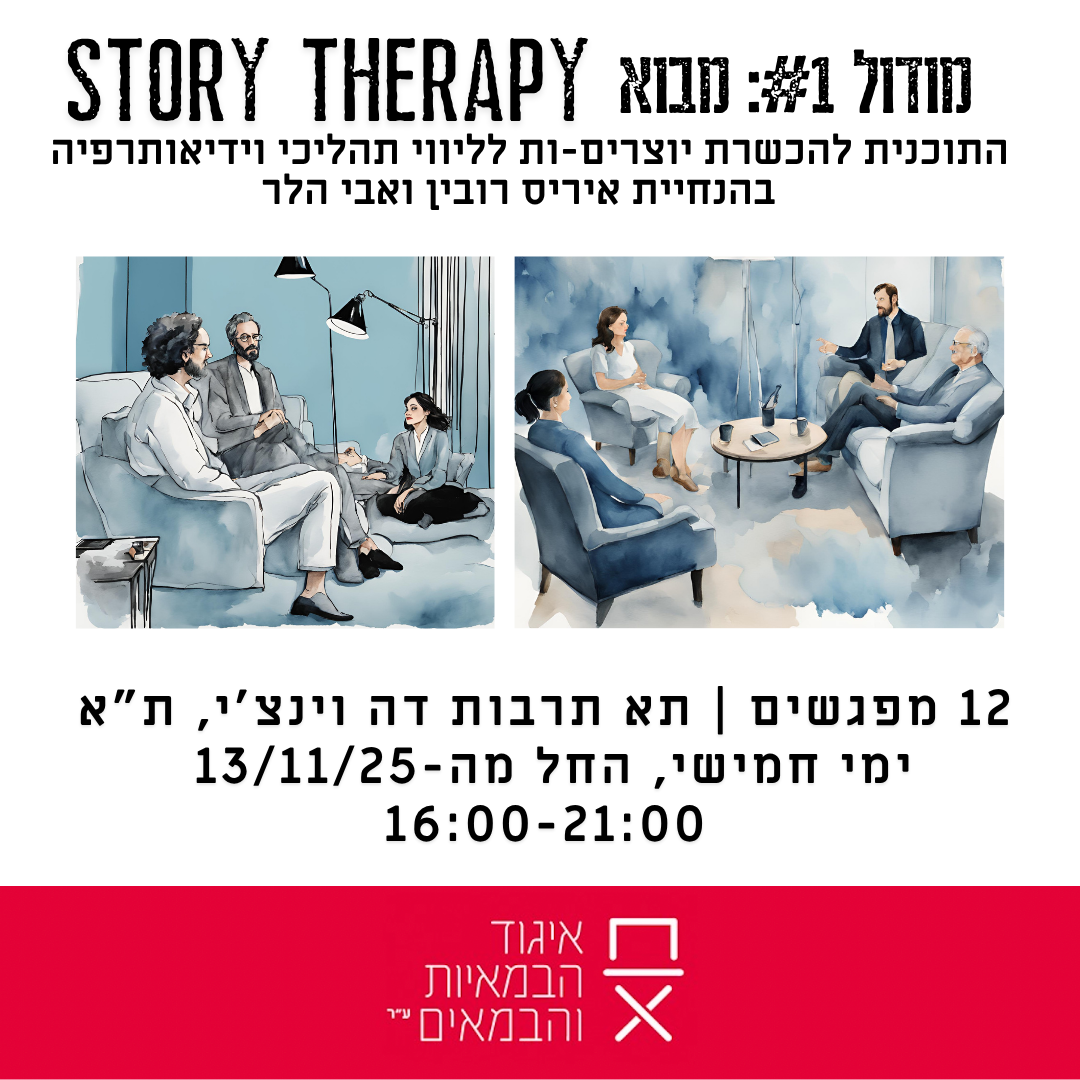 <<תאריך מעודכן>> החל מה-13/11/25, ימי חמישי 16:00-21:00 || ״Story Therapy״ תוכנית המבוא לתוכנית ההכשרה ליוצרי-ות קולנוע, לליווי תהליכי וידיאותרפיה || בהנחיית איריס רובין ואבי הלר
