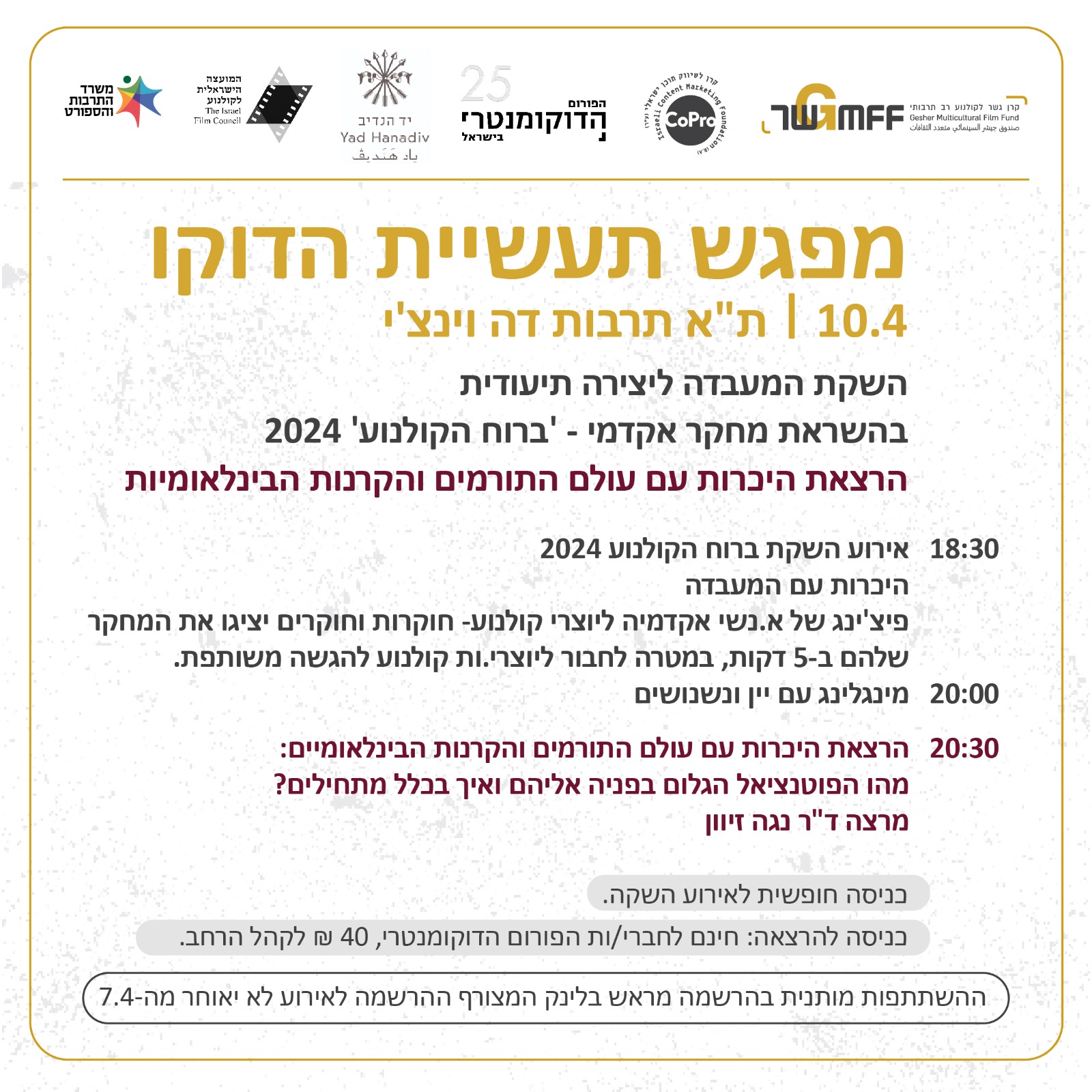 10/4 || השקת המעבדה ליצירה תיעודית בהשראת מחקר אקדמי ‘ברוח הקולנוע’ 2024