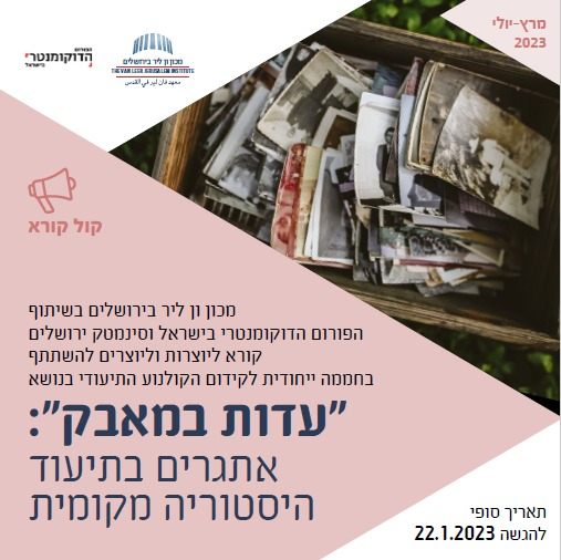 עד 22/1 | מכון ון ליר בירושלים, בשיתוף הפורום הדוקומנטרי בישראל וסינמטק ירושלים, קורא ליוצרות-ים להשתתף בחממה ייחודית לקידום הקולנוע התיעודי, שתתקיים השנה בפעם החמישית תחת הנושא: “עדות במאבק: אתגרים בתיעוד היסטוריה מקומית”
