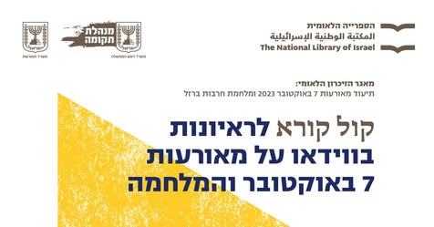 הספרייה הלאומית ומשרד המורשת מזמינים להגיש הצעות למיזמי ראיונות מורשת קצרים, בפורמט וידאו, לצורך תיעוד היסטורי בנושא מאורעות 7 באוקטובר 2023 ומלחמת חרבות ברזל.