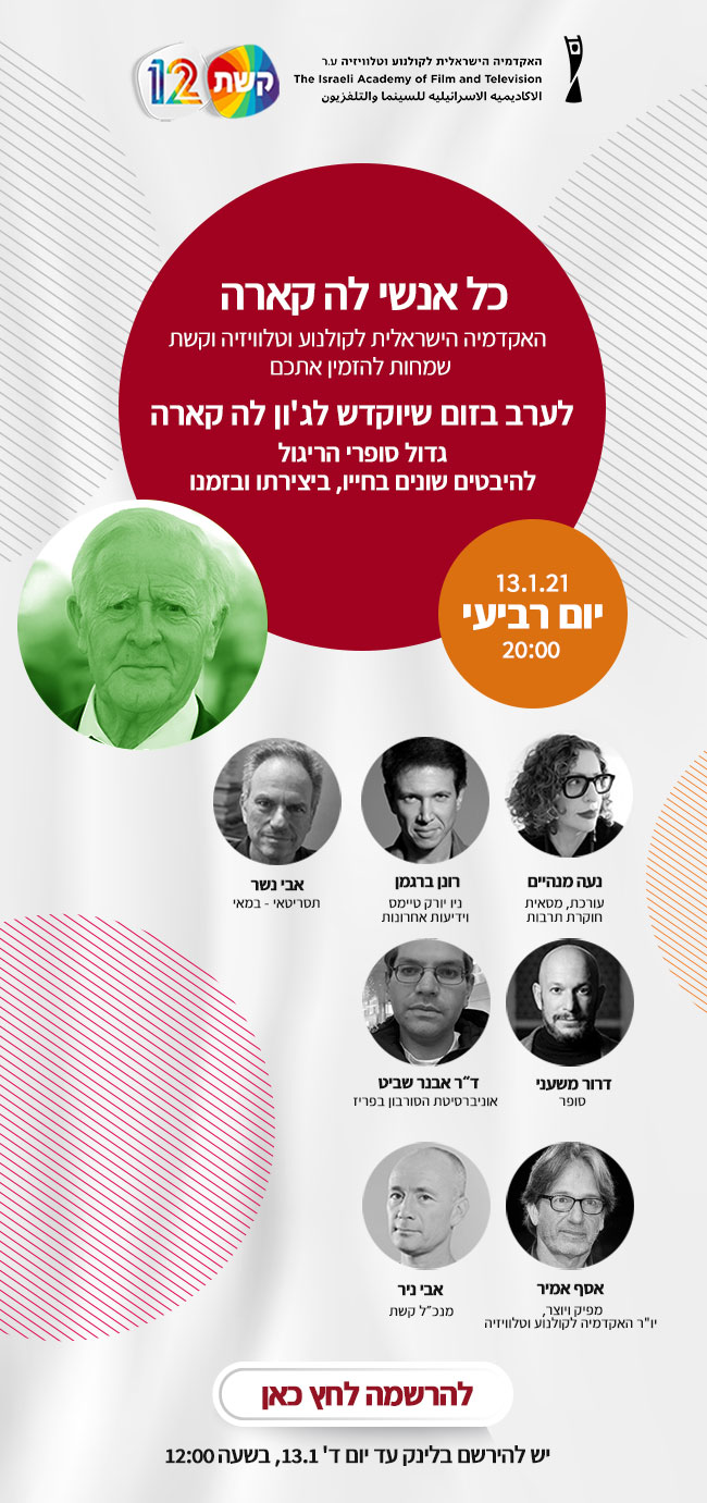 האקדמיה הישראלית לקולנוע וטלוויזיה וקשת מזמינות למפגש זום שיוקדש לסופר ג׳ון לה קארה. ההשתתפות חופשית לחברי-ות האיגוד
