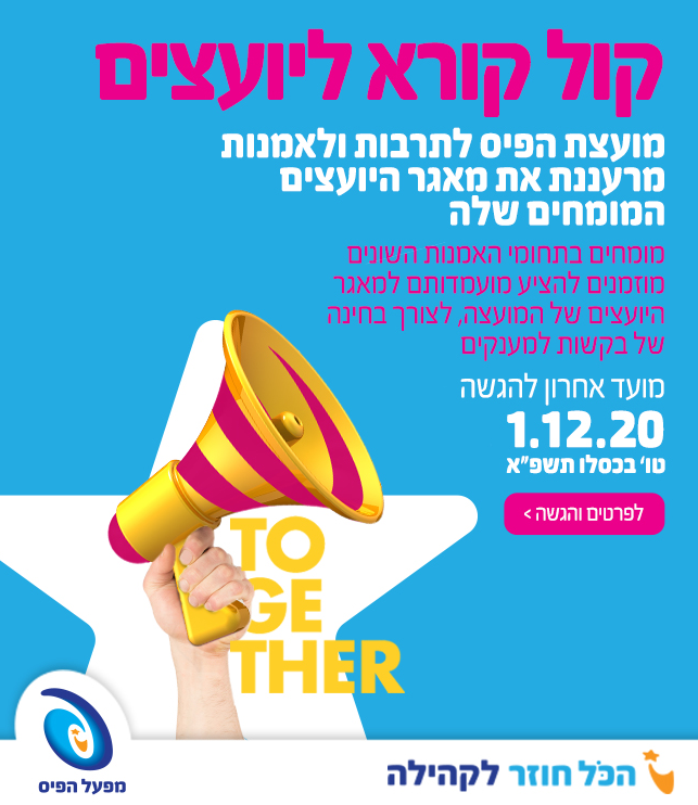 עד 1/12 | מועצת הפיס לתרבות ולאמנות מרעננת את מאגר היועצים-ות המומחים-ות שלה, ומזמינה בזאת יועצים-ות מומחים-ות בתחומי אמנות להציע מועמדותם למאגר