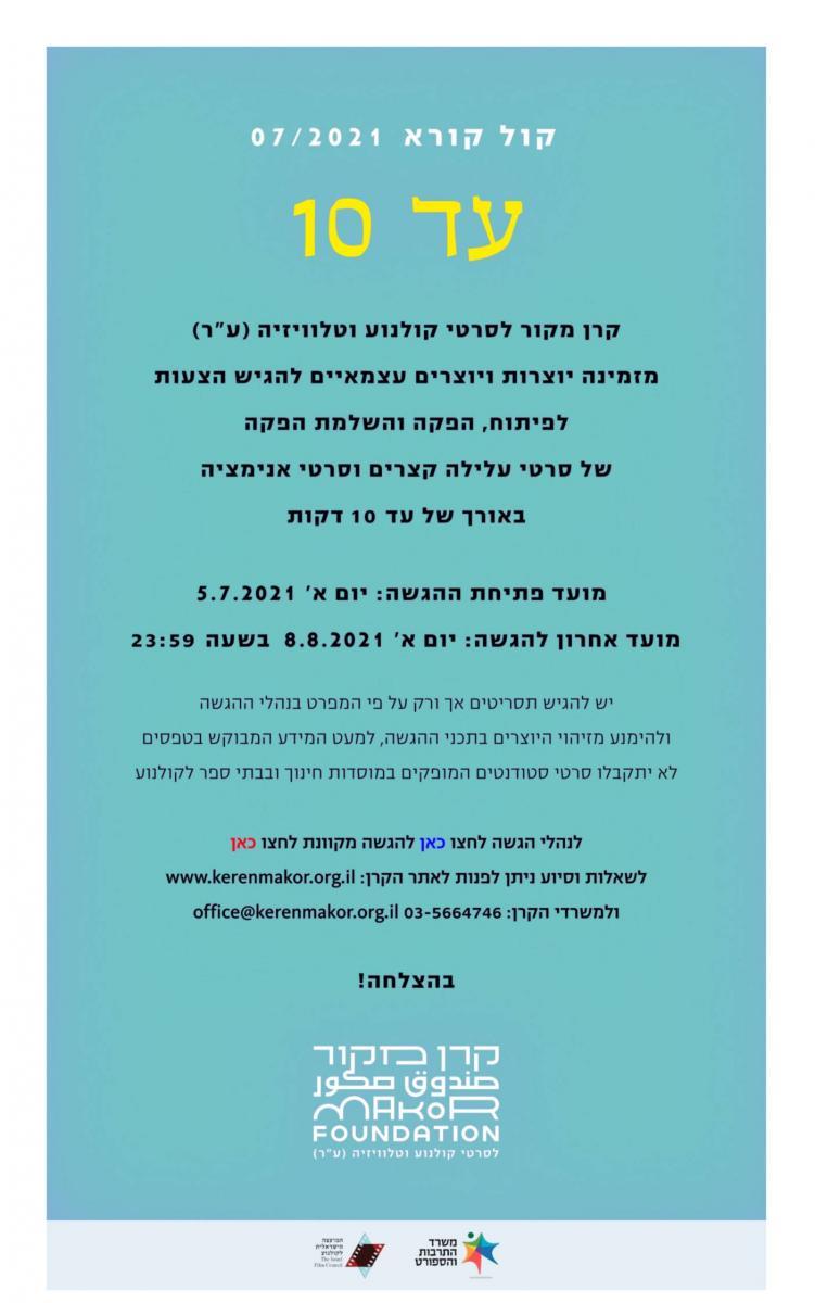 קרן מקור לסרטי קולנוע וטלוויזיה מזמינה יוצרים-ות להגיש הצעות לפיתוח, הפקה והשלמת הפקה לסרטים קצרים עלילתיים, וסרטי אנימציה באורך של עד 10 דקות, בנושאים על פי בחירת המגישים-ות.