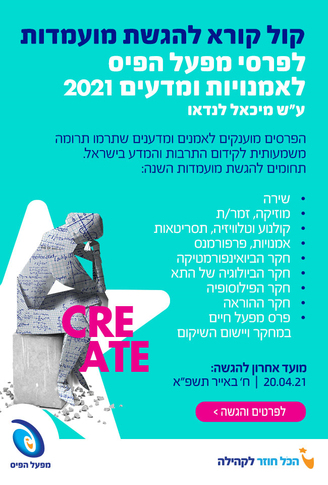 נדחה הדדליין! עד 2/5 | מפעל הפיס קורא לאמנים-ות ולמדענים-ות שהגיעו להישגים בתחומם ותרמו תרומה משמעותית לקידום התרבות והמדע בישראל, להגיש מועמדות לקבלת פרס מפעל הפיס לאמנויות ולמדעים ע”ש לנדאו, ע״ס 150 אלף ש״ח