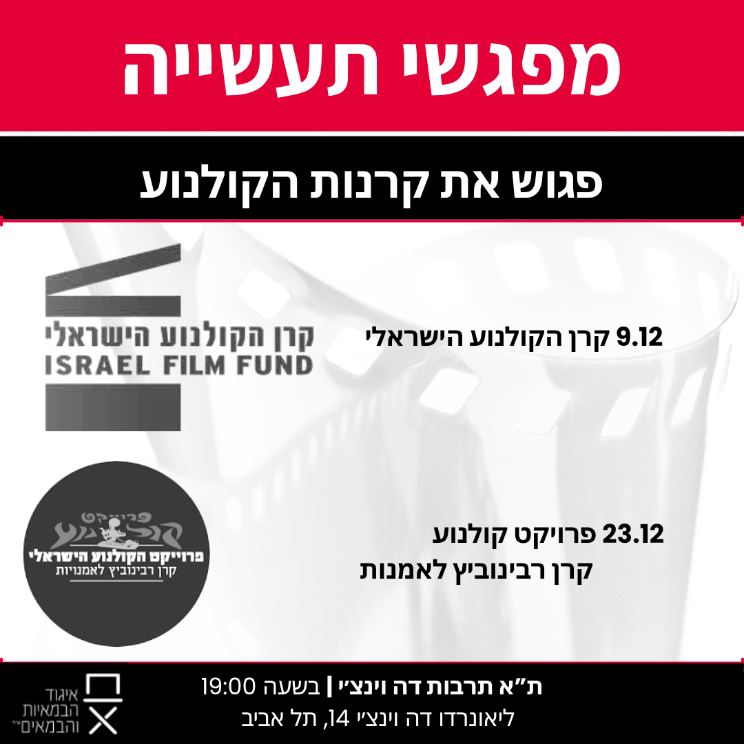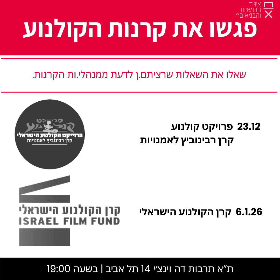 נובמבר- דצמבר 25 || מוזמנים.ות: מפגשי תעשייה – סדרת מפגשים עם גורמי תעשייה עבור חברי.ות איגוד הבמאיות והבמאים