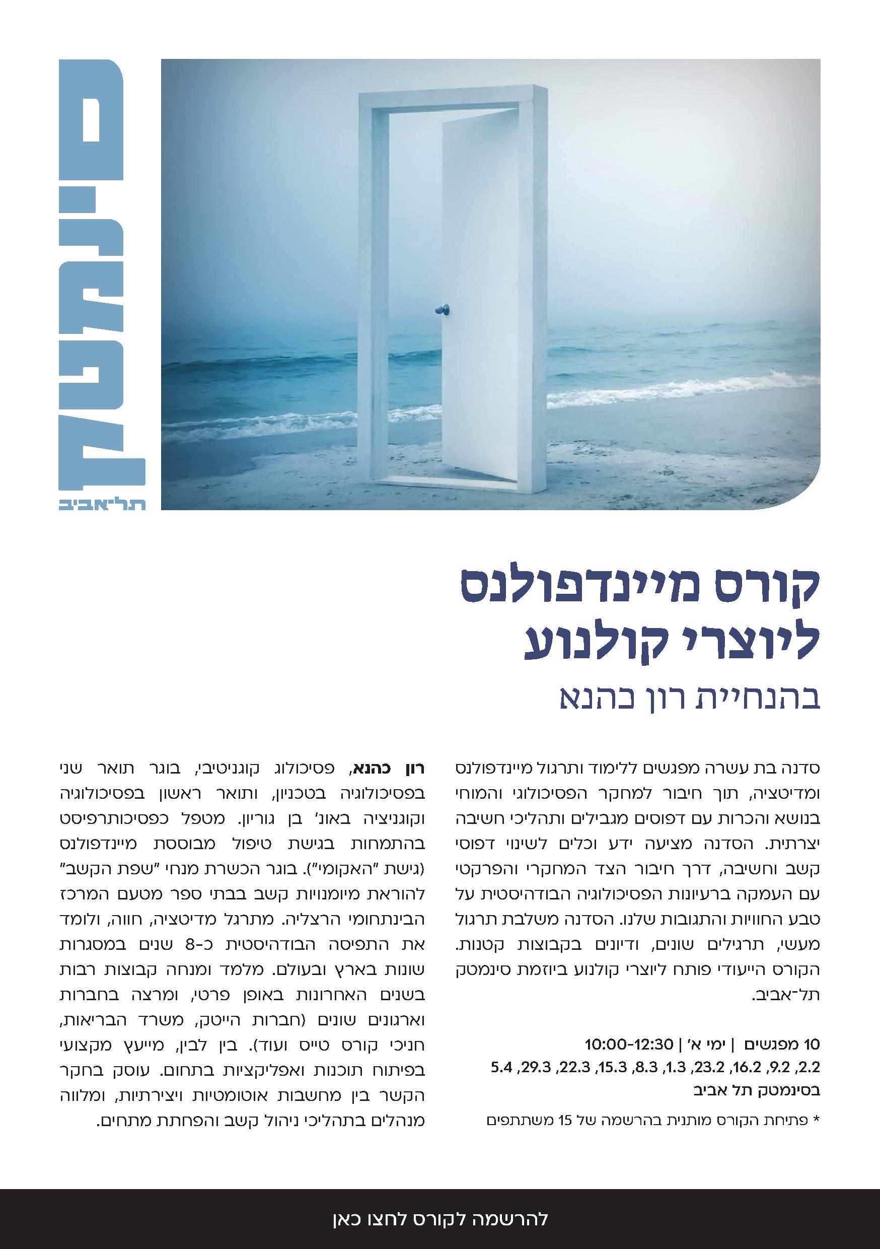 ינחה את הקורס רון כהנא – פסיכולוג קוגניטיבי ומטפל בשיטות מבוססות מיינדפולנס. הקורס יתפרש על פניי עשרה מפגשים שבועיים, החל מתחילת פברואר, בסינממטק תל אביב.