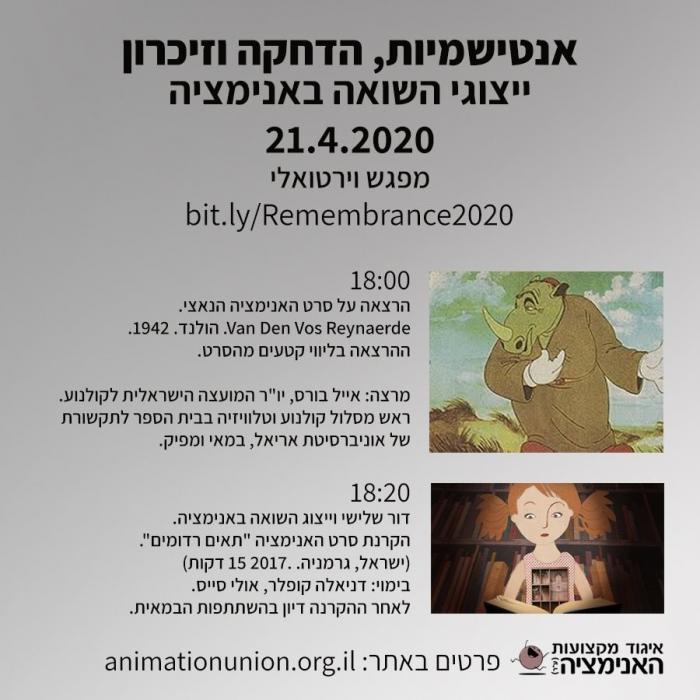 ב-21/4 | איגוד מקצועות האנימציה מזמין למפגש (בZOOM, כמובן) בנושא ״אנטישמיות, הדחקה וזיכרון: ייצוגי השואה באנימציה״, שיתקיים ביום הזיכורן לשואה.
