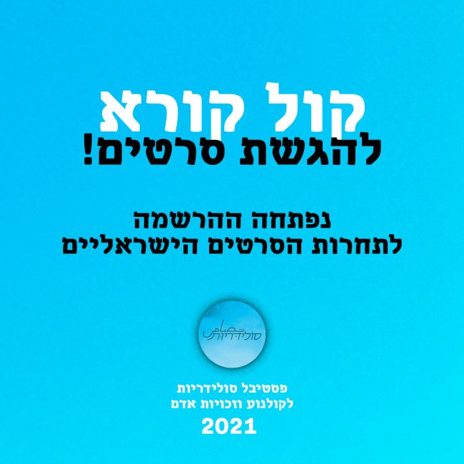 פסטיבל סולידריות לקולנוע וזכויות אדם מזמין יוצרים-ות קולנוע להגיש סרטים שטרם הוקרנו בישראל, למסלולי תחרות הסרטים הישראליים לשנת 2021. ניתן להגיש סרטים עלילתיים ותיעודיים ארוכים וקצרים בנושאי זכויות אדם וסולידריות חברתית.