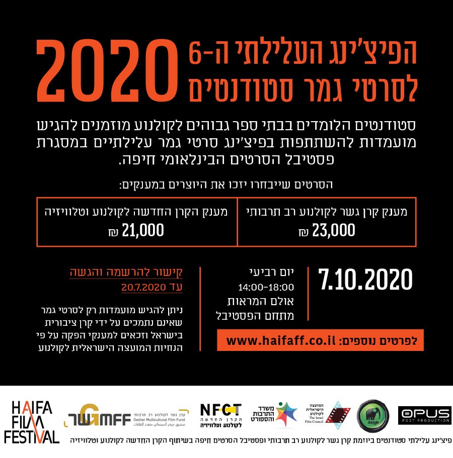 נפתחה ההגשה לפיצ’ינג העלילתי ה-6 לסרטי גמר סטודנטים לשנת 2020 במסגרת פסטיבל הסרטים הבינלאומי חיפה. הסרטים הנבחרים יזכו במענקי הפקה