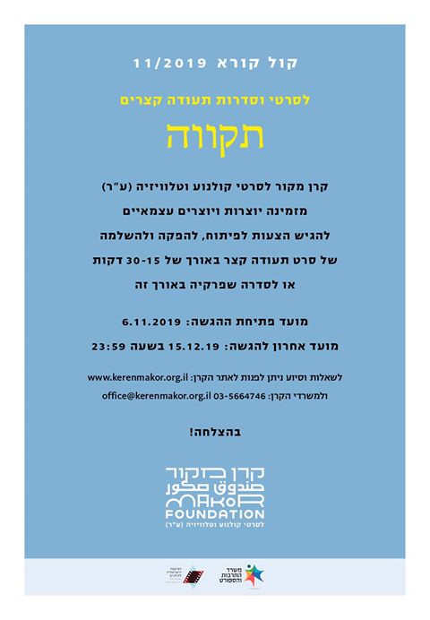 עד 15/12 | קרן מקור לסרטי קולנוע וטלוויזיה מזמינה יוצרים-ות להגיש הצעות לפיתוח, להפקה ולהשלמה של סרט תעודה קצר באורך 15 עד 30 דקות או לסדרה שפרקיה באורך זה, בנושא: תקווה.