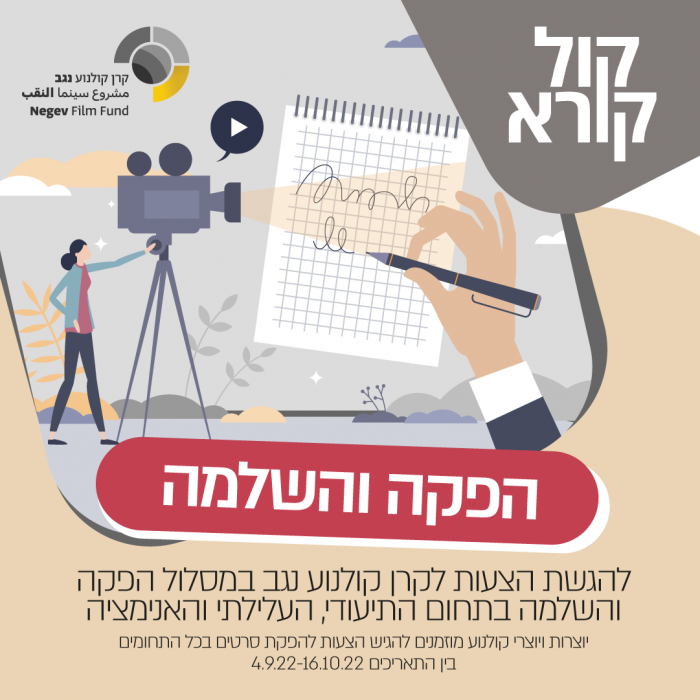 עד 16/10 | קרן קולנוע נגב מזמינה יוצרי-ות קולנוע להגיש הצעות במסלול הפקה והשלמה, לסרטים ארוכים וקצרים בתחום התיעודי, העלילתי והאנימציה.