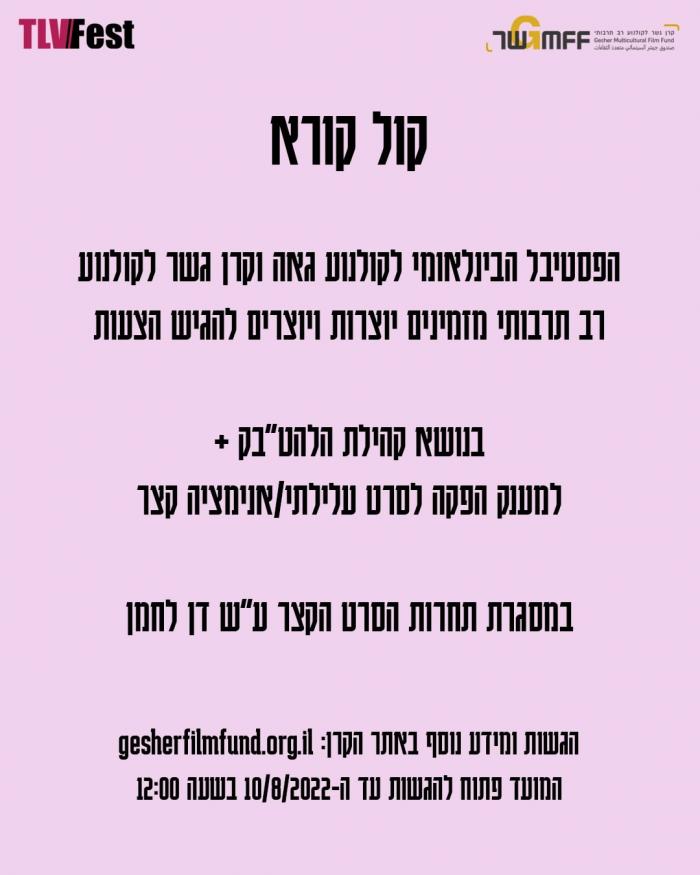 עד 10/8 | קרן גשר לקולנוע רב תרבותי והפסטיבל הבינלאומי לקולנוע גאה מזמינים יוצרים-ות להגיש סרטים למסלול מענק הפקה לסרט עלילתי או אנימציה קצר בנושא קהילת הלהט”בק