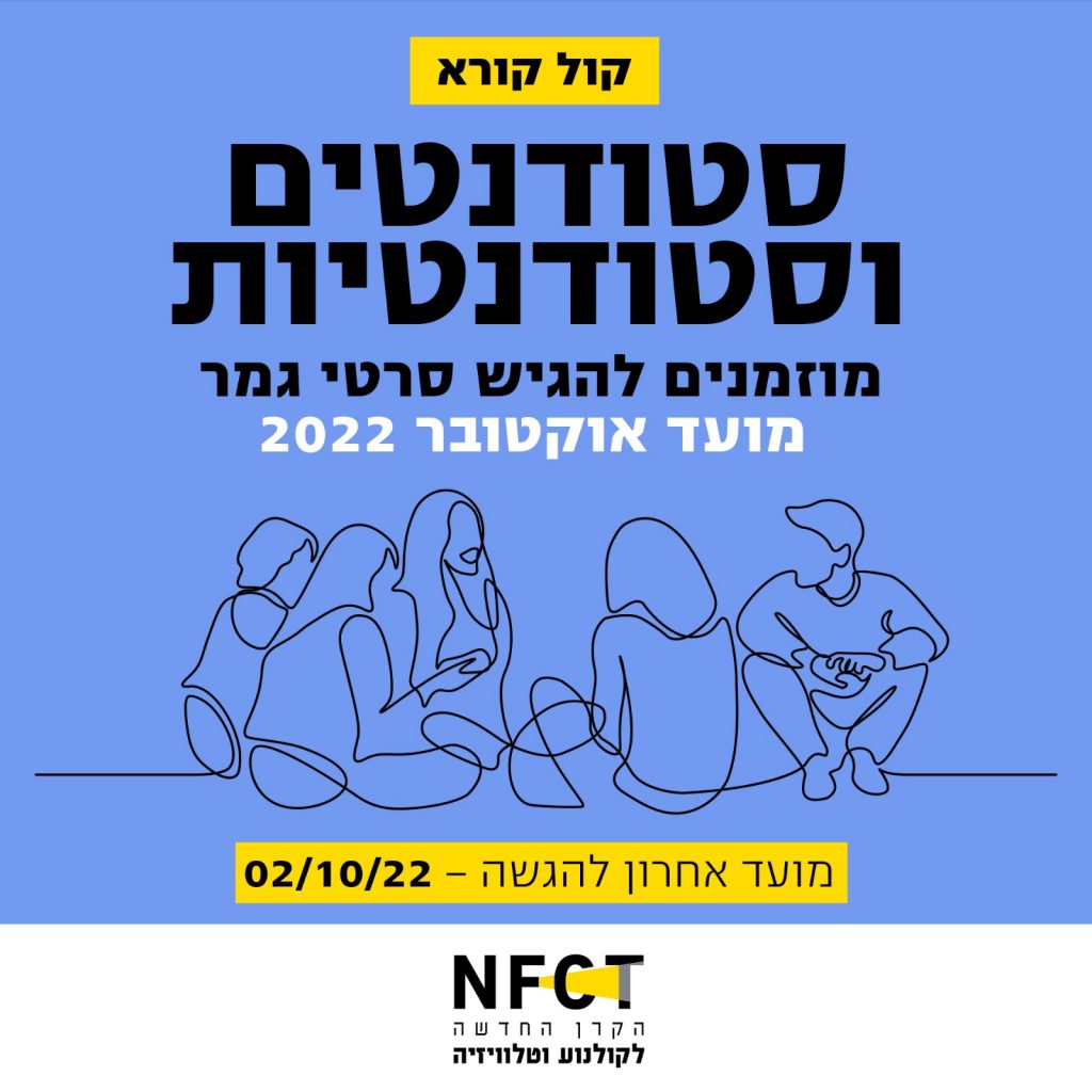 עד 2/10 | הקרן החדשה לקולנוע וטלוויזיה מכריזה על מועד שני להגשה לשנת 2022 ומזמינה סטודנטים וסטודנטיות לקולנוע להגיש סרטי גמר, במועד אוקטובר 2022