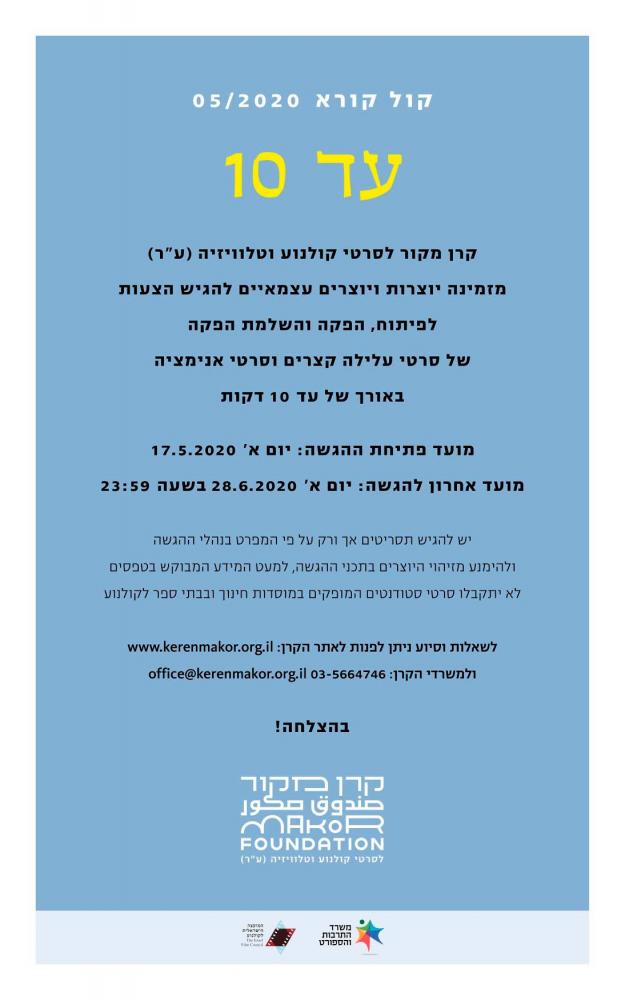 קרן מקור מזמינה יוצרים ויוצרות עצמאים-ות להגיש תסריטים למיזם ״עד 10״, להפקת סרטים קצרים עלילתיים וסרטי אנימציה באורך של עד 10 דקות.